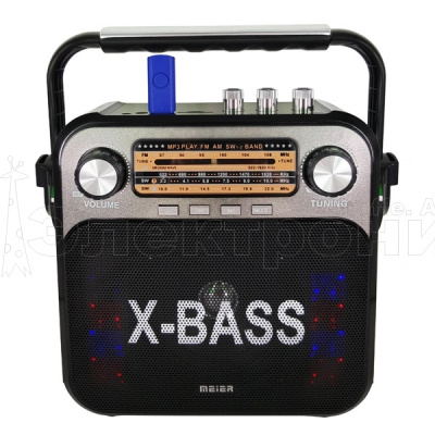 FM: 87-108 MHz AM: 522-1620 KHz SW: 3.2-22 MHz Фонарик 9Led Функция светомузыки Пульт ДУ Разъёмы: USB,SD(до 32Гб), AUX, TF(до 32Гб) Питание: аккумулятор встроенный (зарядка 6V) / 220V шнур в комплекте / 4*R20 (в комплект не входят) Размер: 23 х 22 х 10 см