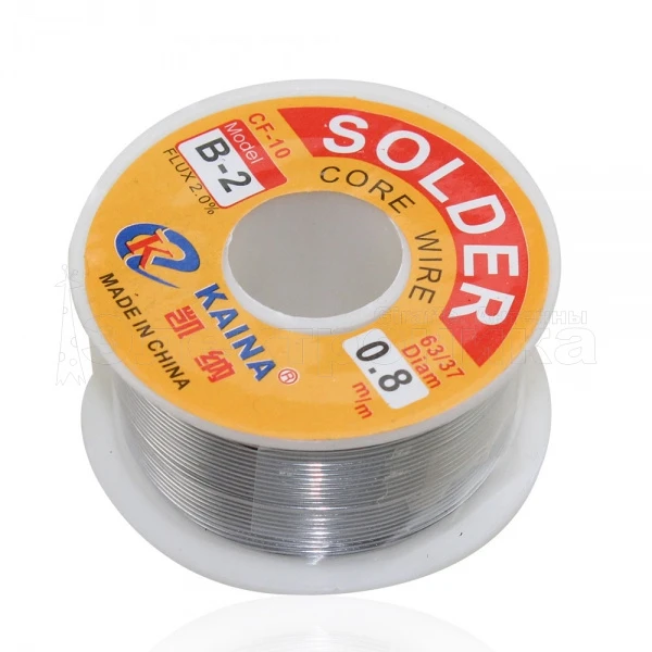 Припой-катушка в проволоке c флюсом Применяется в радиопромышленности для лужения и пайки паяльником электро и радио аппаратуры. Состав: Sn (олово) — 63%, Pb (свинец) — 37%, Флюс 2%, Cl (хлор в качестве флюса) — менее 0, 1%. Диаметр припоя составляет 1мм, вес: 105 г., температура плавления: 183 C